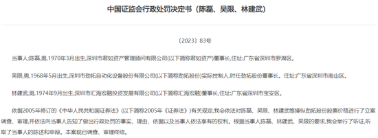中国证监会决定对3人合谋操纵“劲拓股份”价格的行为没收违法所得共计1.65亿元,并处以4.96亿元的罚款,违法所得及罚款合计6.61亿元。