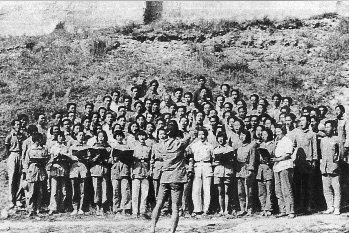 △《黄河大合唱》在延安演出(图自人教版音乐六年级下册)